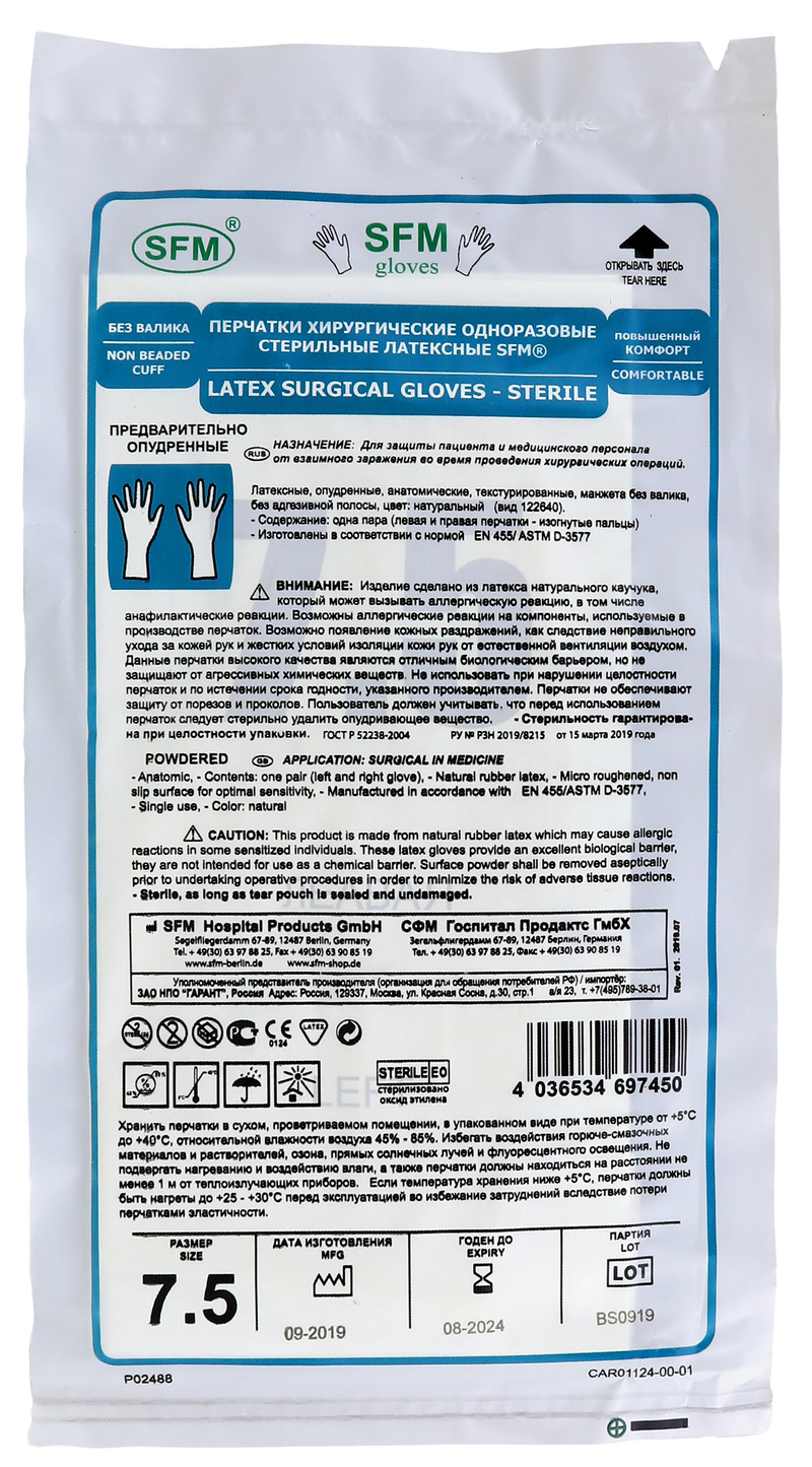 Название в РУ: Перчатки хирургические одноразовые стерильные латексные SFM® латексные, опудренные, анатомические, текстурированные, манжета с валиком, без адгезивной полосы, цвет: натуральный (вид 122630).