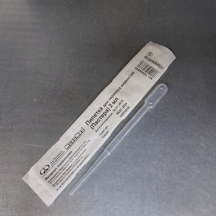 Пипетка Пастера 2 мл стерильная градуированная в индивидуальной упаковке предназначена для дозирования и переноса жидкостей. Имеет каплю заданного объема и замкнутый резервуар для заполнения, исключающий контаминацию. Изготовлена из полиэтилена низкого давления (ПЭНД).
