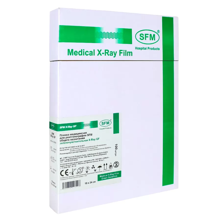 - Зелёночувствительная медицинская ретгенографическая плёнка SFM X-RAY GF прездназначена для использования с недорогими экранами SFM класса 200 или 400.