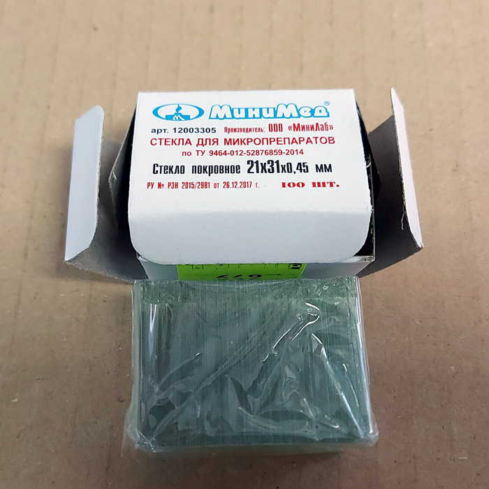 Покровные стекла увеличенного размера 21х31 мм для 4-х сеточной счетной камеры Горяева. Изготовлены из прозрачного бесцветного силикатного стекла. В упаковке 100 шт.