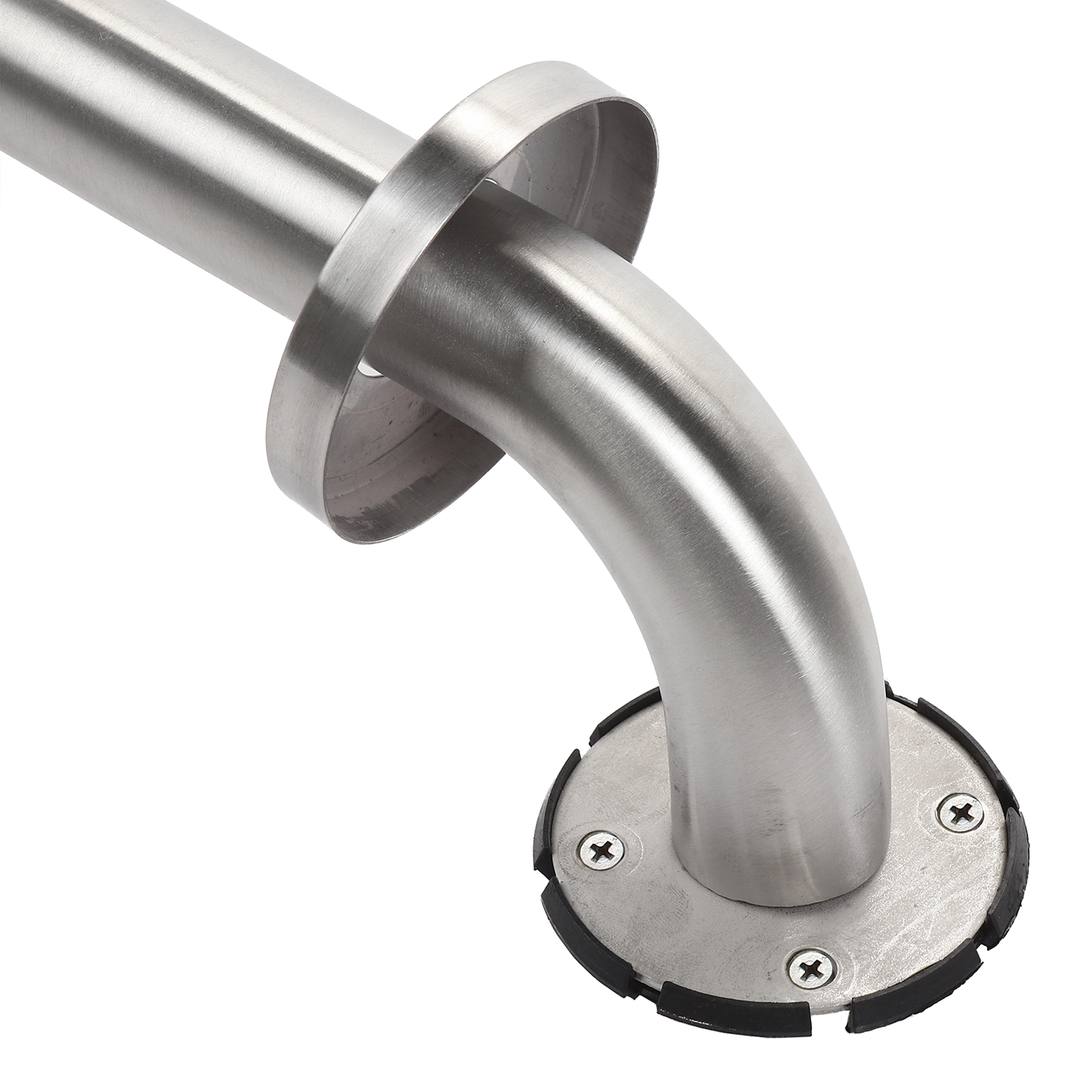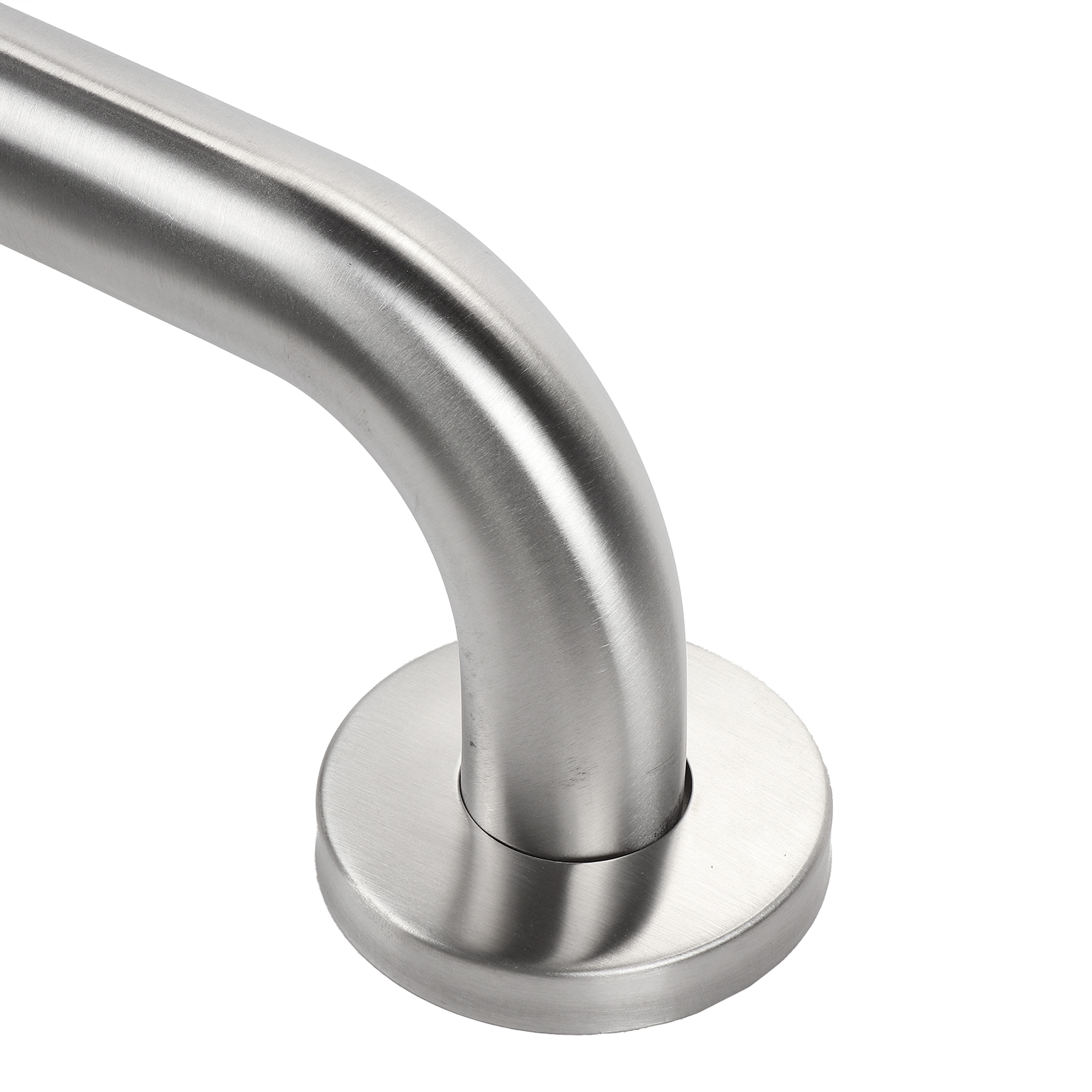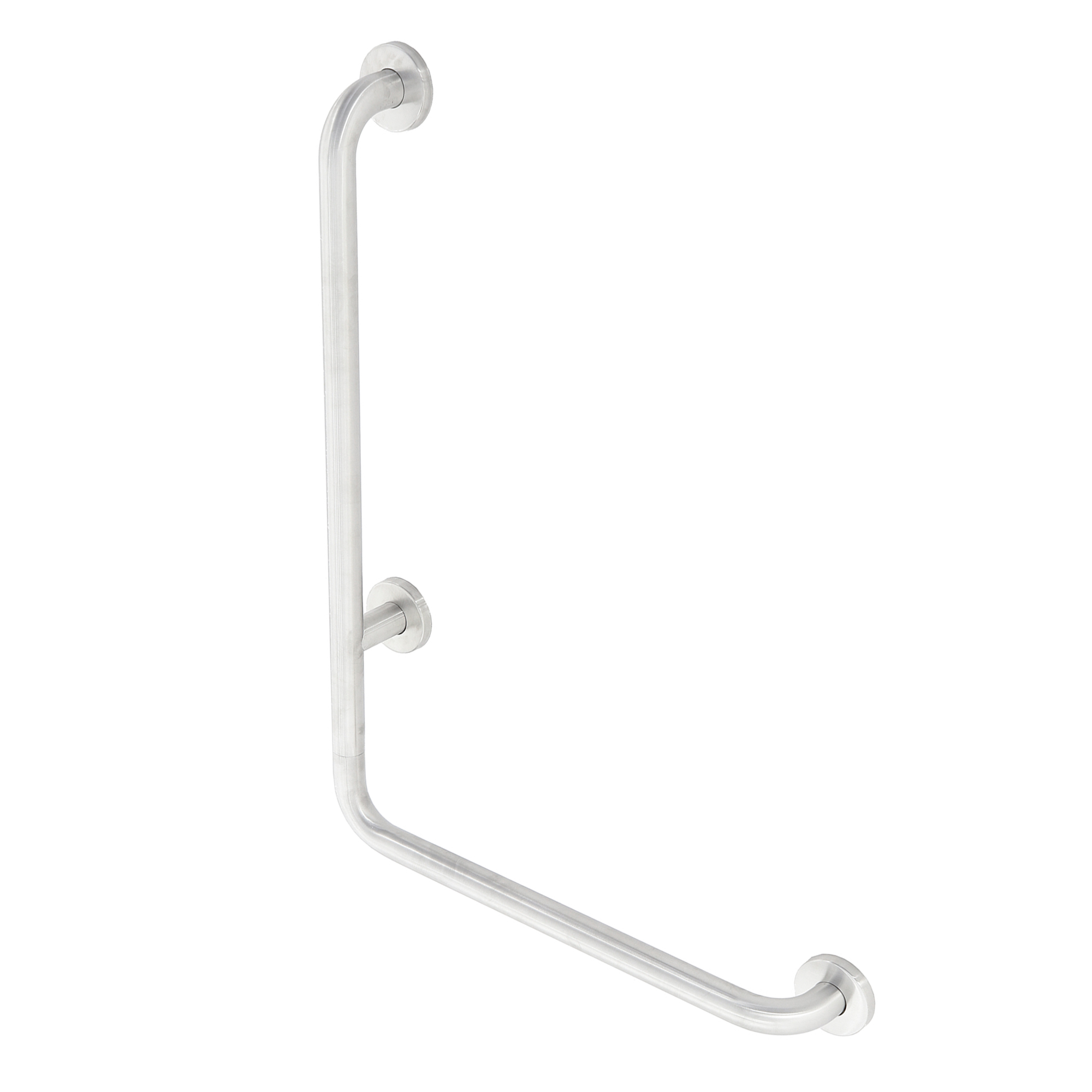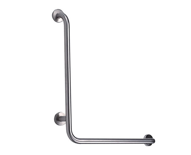 Угловой настенный поручень для монтажа на плоские поверхности стен. Двухсекционная конструкция с угловым соединением обеспечивает надежную опору в жилых и общественных помещениях.