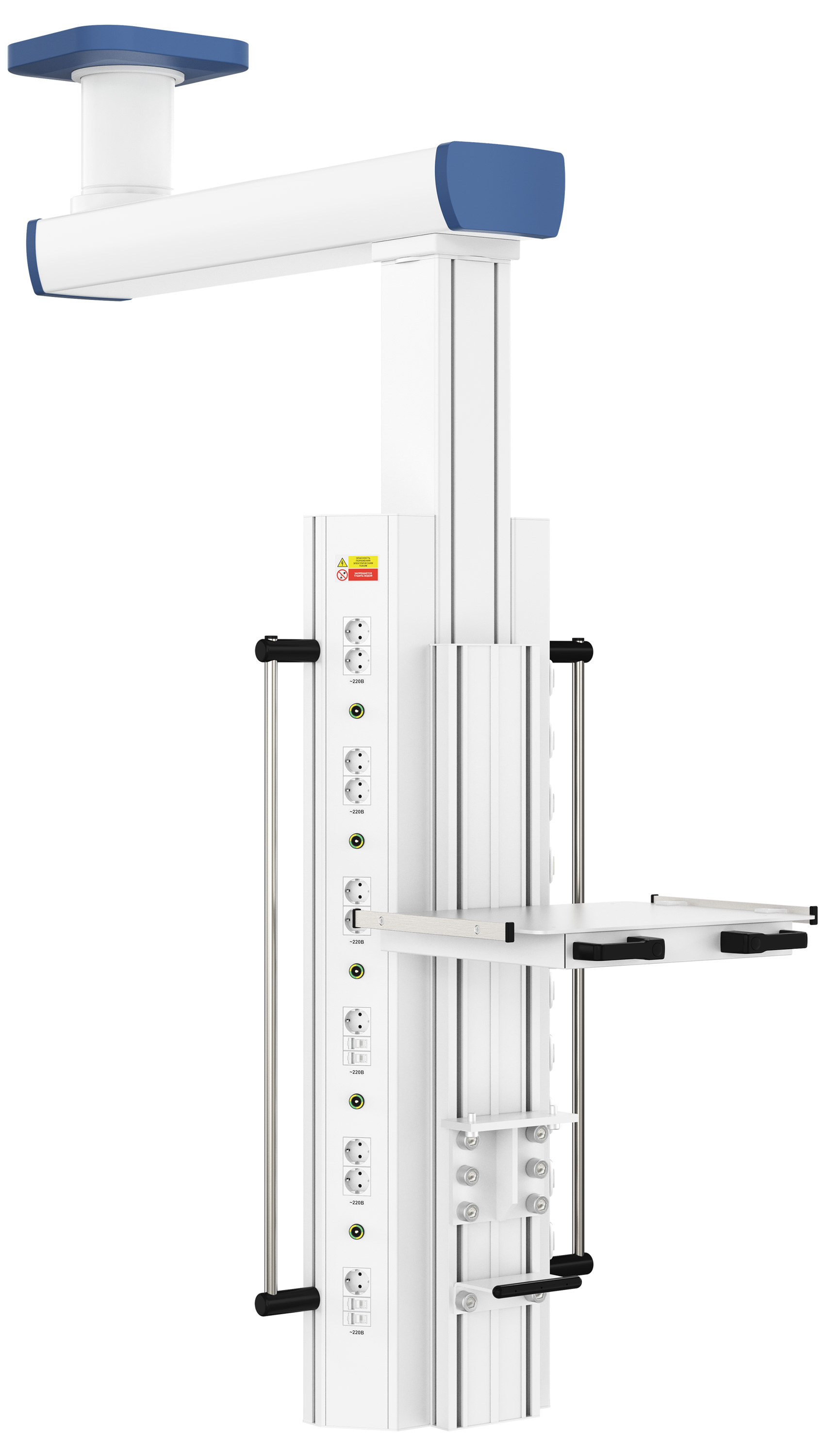 Для размещения вспомогательного медицинского оборудования шкаф источников медгазов и электропитания может быть укомплектован полками различных модификаций, которые оснащаются кнопкой управления тормозной системой, выдвижными ящиками и/или медицинскими рельсами для крепления навесного оборудования. Угол поворота шкафа источников медицинских газов до 320 градусов, а также удобные ручки обеспечивают мобильность универсальной подвесной системы CADUCEUS (Кадуцей) C1-VE, что делает ее использование максимально удобным.