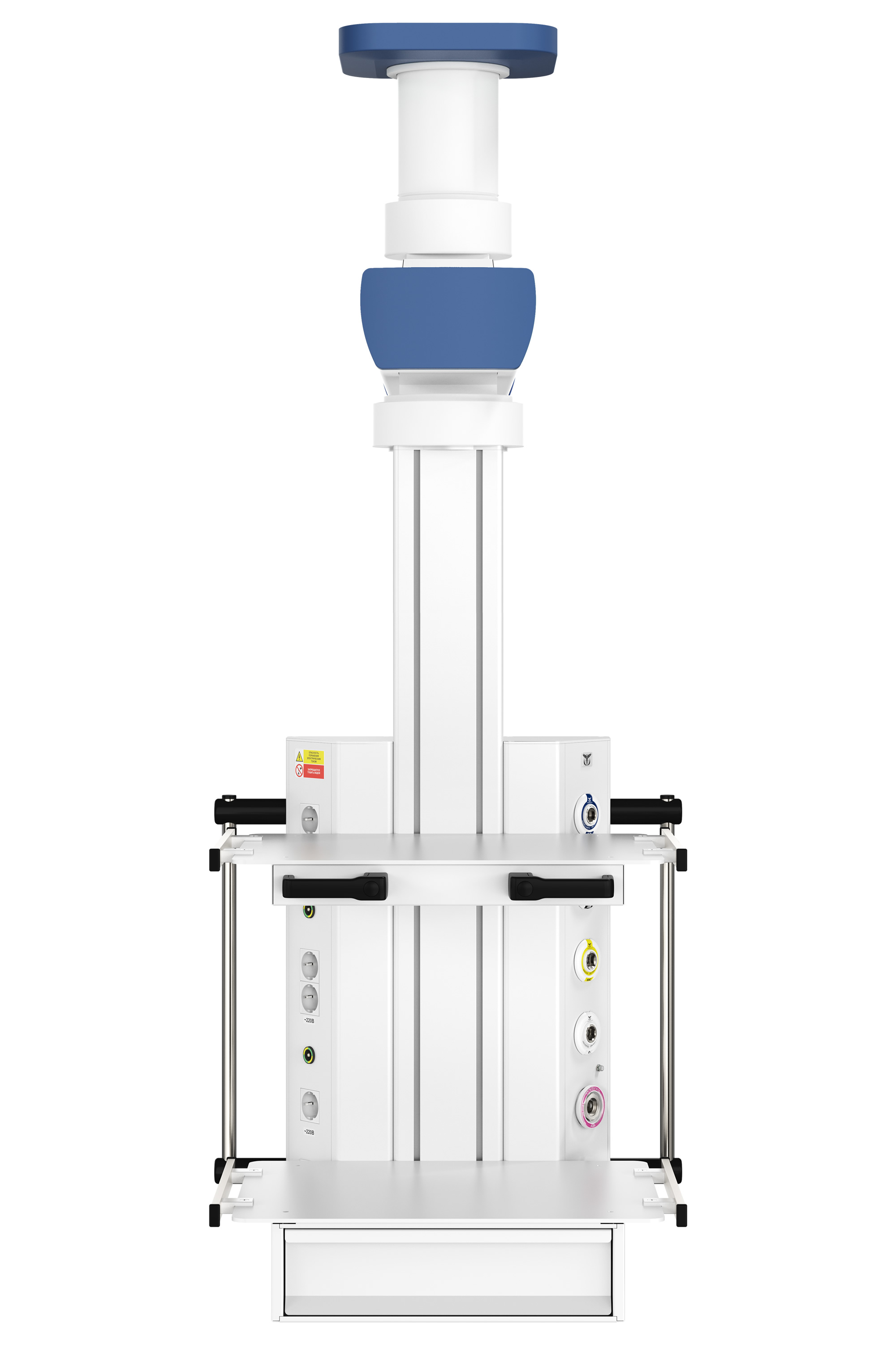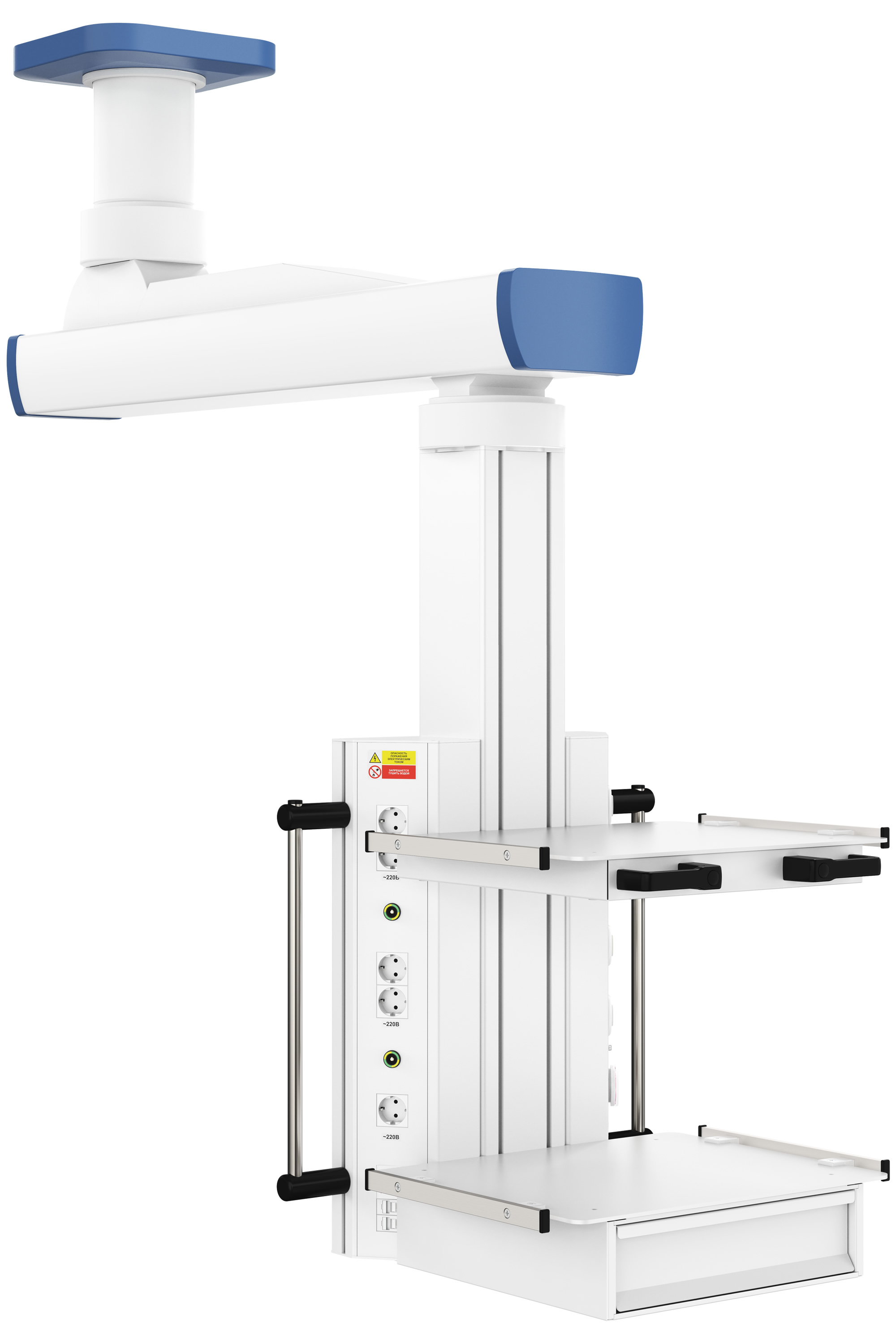 с поворотно-подъемным плечом, вращающимся вертикальным шкафом источников медгазов и электропитания незаменима при использовании в палатах скорой и неотложной помощи, а также малых операционных залах и палатах интенсивной терапии. Мобильность конструкции обеспечивает наличие поворотного плеча длиной 900 мм и регулировка по высоте в диапазоне до 600 мм. Удобная эргономичная ручка, расположенная на передней части шкафа медицинских газов и электроснабжения, позволяет оперативно перемещать конструкцию подвесной системы CADUCEUS (Кадуцей) C1E-V в пространстве, не прилагая особых усилий, а функция блокировки дает возможность фиксировать консоль в заданной точке пространства.