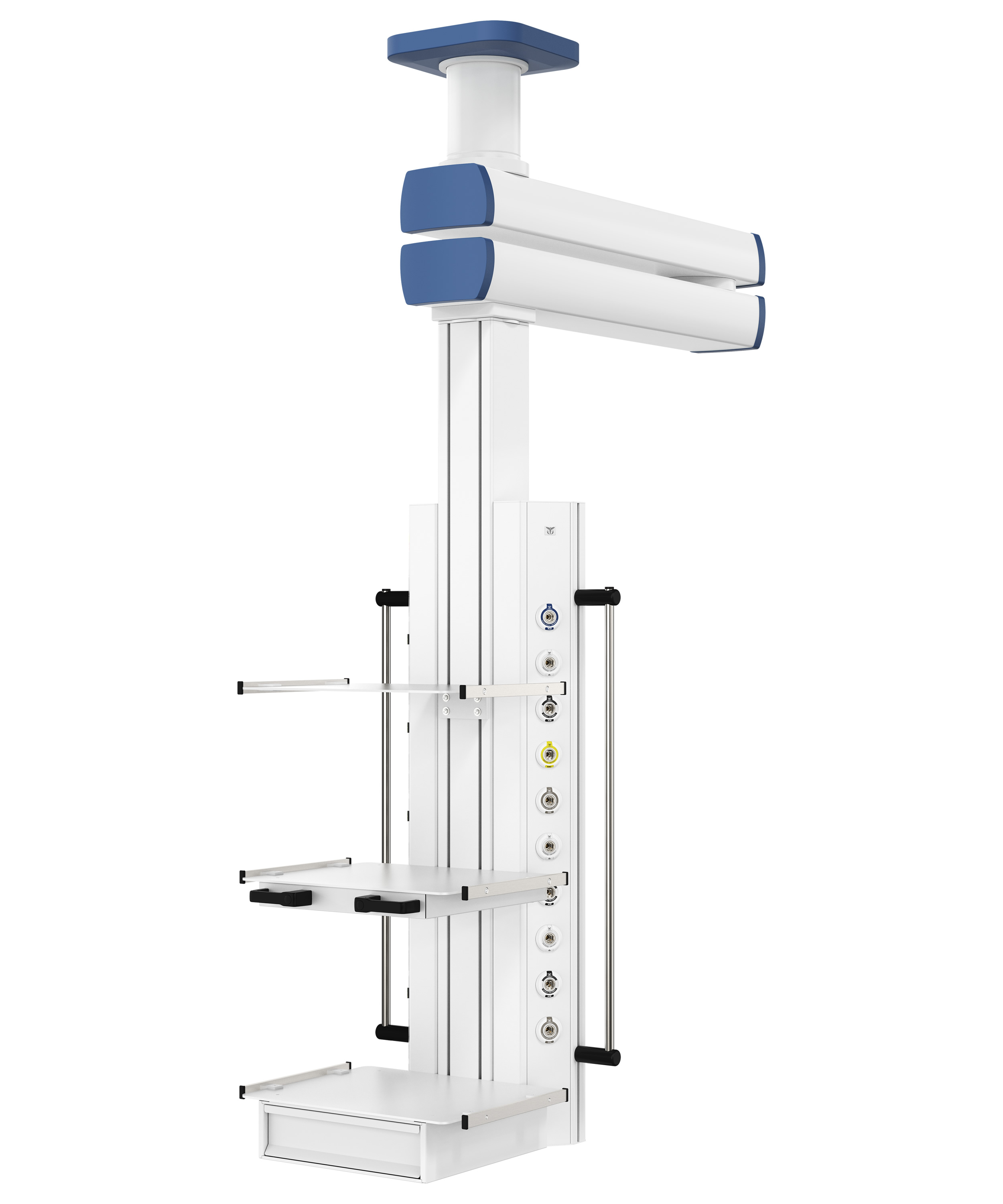 Для удобства медицинского персонала, газовые клапаны стандарта DIN 13260-2 размещены с одной стороны корпуса, а электрические и слаботочные розетки – с другой. Наличие центральной подвижной площадки позволяет устанавливать индивидуальное крепление анестезиологического аппарата, а для удобного размещения вспомогательного медицинского оборудования на шкафу можно расположить от 1 до 4 полок различных модификаций, при этом полки могут оснащаться медицинскими рельсами или выдвижными ящиками.
