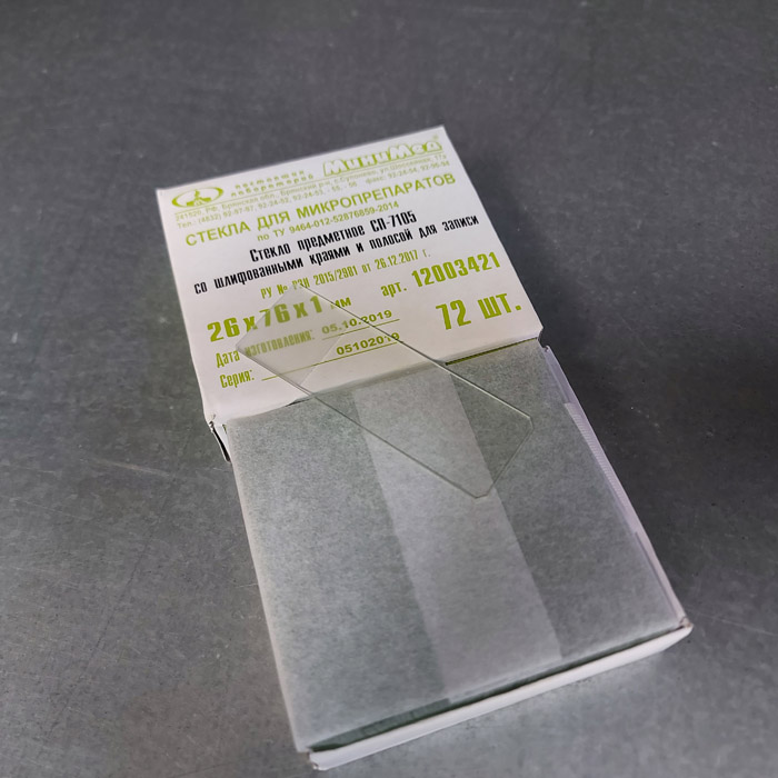 Предметные стекла 26х76 мм толщиной 1 мм со шлифованными краями и полосой для записи. Изготовлены из прозрачного бесцветного силикатного стекла. В упаковке 72 шт.
