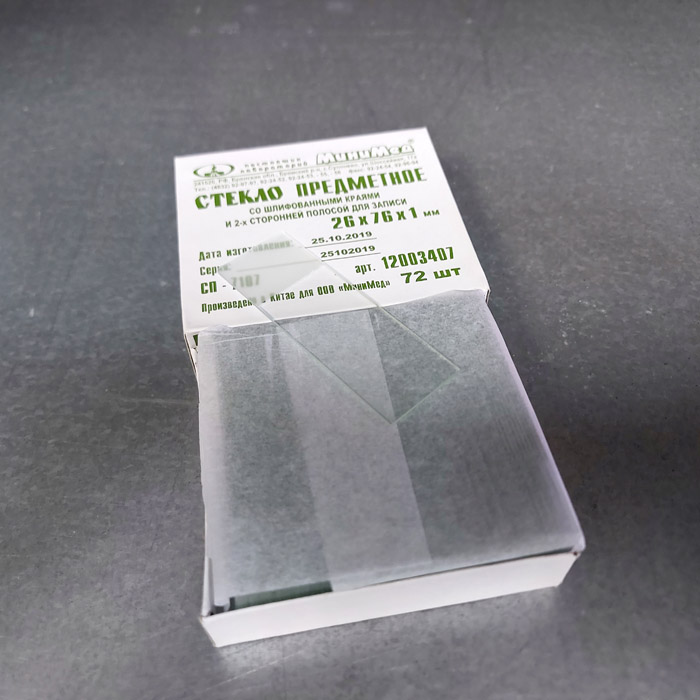Предметные стекла 26х76 мм толщиной 1 мм со шлифованными краями и 2-х сторонней полосой для записи. Изготовлены из прозрачного бесцветного силикатного стекла. В упаковке 72 шт.