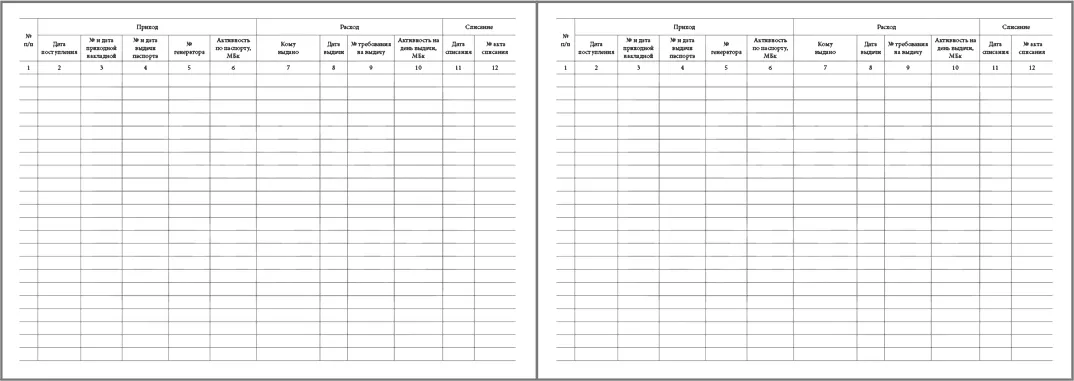 Графы для заполнения приходно-расходного журнала учета генераторов короткоживущих радионуклидов: