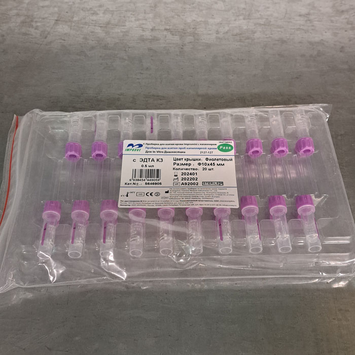 Пробирка для взятия капиллярной крови IMPROMINI с капилляром предназначена для гематологических исследований крови. Встроенный капилляр позволяет быстро и аккуратно набрать кровь в пробирку. Вторая крышка на петле обеспечивает сохранность пробы при транспортировке после удаления капилляра. Внутренние стенки обработаны антикоагулянтом — ЭДТА-К3.