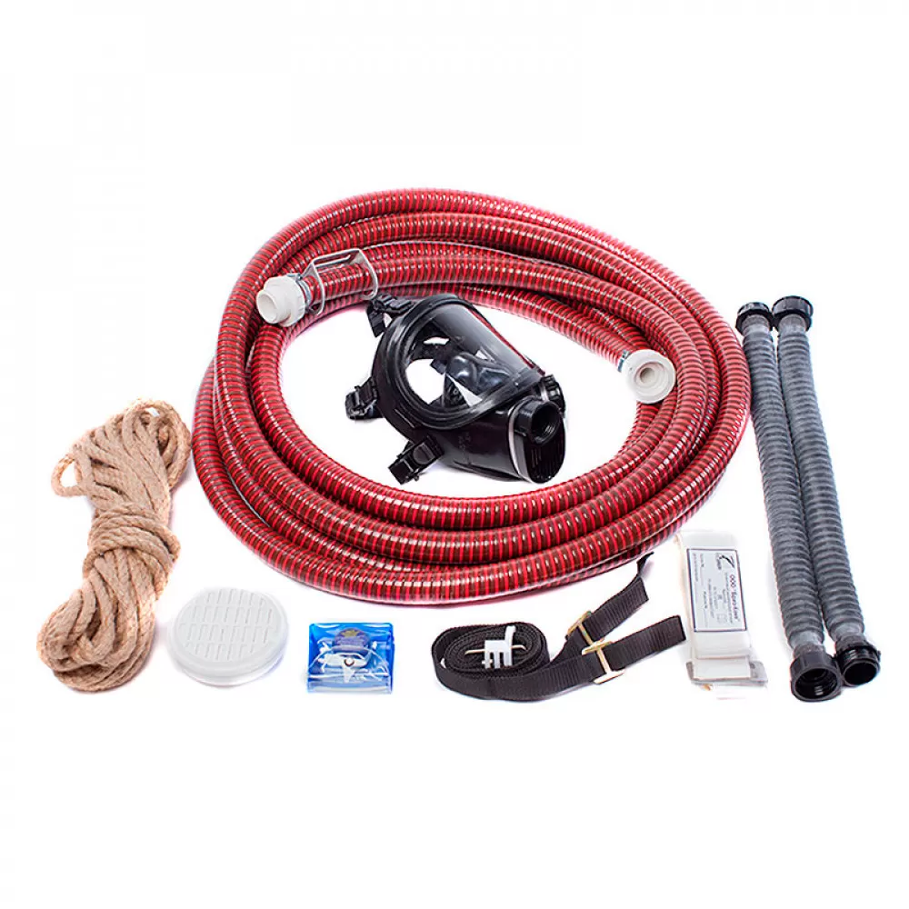- Шланговые противогазы состоят из шлем-маски, двух гофрированных трубок, шлангов, пылевого фильтра, барабана или сумки для хранения шланга. Также изделия могут быть оснащены воздуходувкой (при длине шлангов 20 и 40 метров).