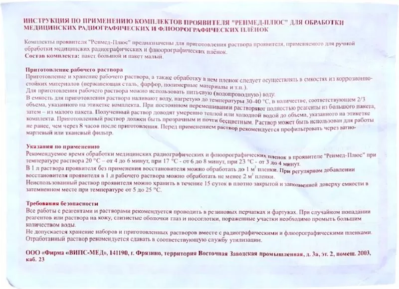- Один литр раствора используется для проявления 2 кв.м рентгеновской или флюорографической пленки в условиях регулярного добавления в жидкость восстановителя.
