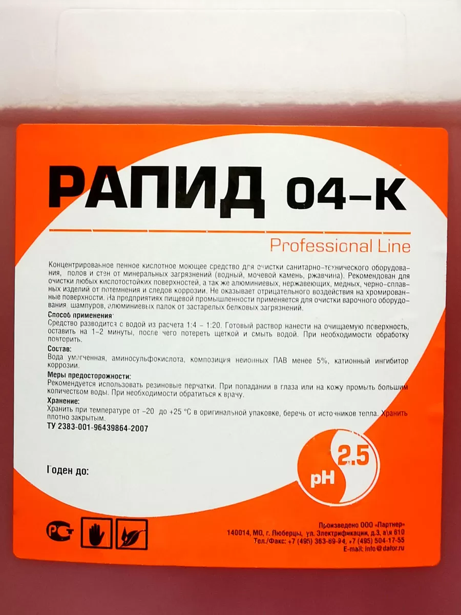 Жидкое концентрированное кислотное пенно-моющее средство для очистки санитарно-технического оборудования, полов стен от минеральных загрязнений (водный, мочевой камень, ржавчина). Рекомендовано для очистки любых кислотостойких поверхностей, а так же алюминиевых, нержавеющих, медных, черно-сплавных изделий от потемнения и следов коррозий. Не оказывает отрицательного воздействия на хромированные поверхности. На предприятиях пищевой промышленности применяется для очистки варочного оборудования, шампуров, алюминиевых палок от застарелых белковых загрязнений.