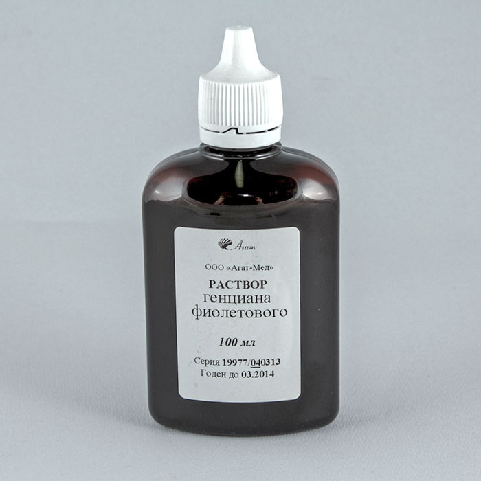 Состав: Раствор генциана фиолетового (фенол – 10 г/л, кристаллический фиолетовый – 10 г/л, спирт этиловый – 10%), 100 мл – 1 флакон