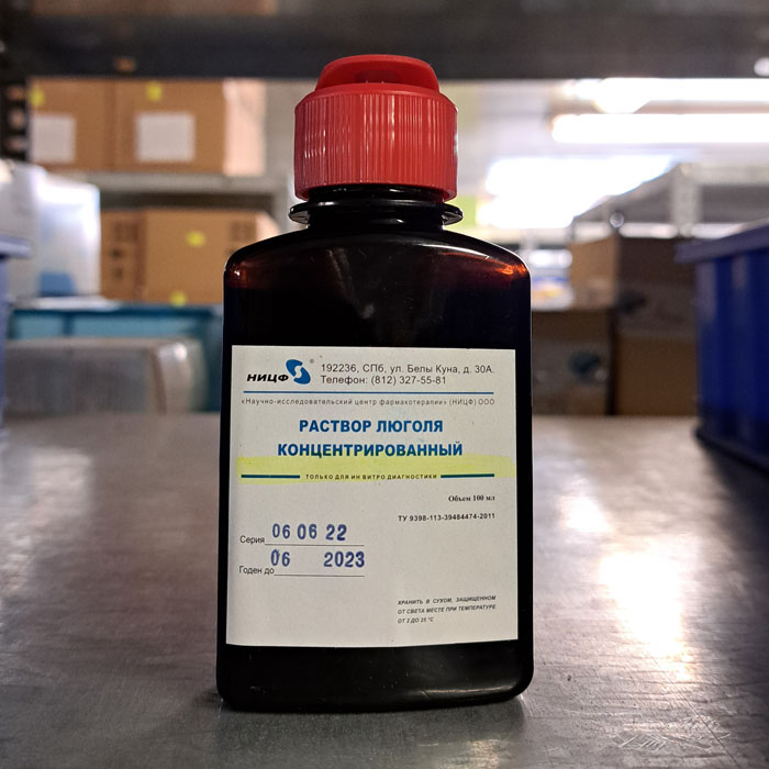 Раствор Люголя концентрированный предназначен для использования в качестве компонента сред для селективного накопления сальмонелл: тетратионатовый бульон Мюллера-Кауфмана, жидкая тетратионатная среда (Мюллера).