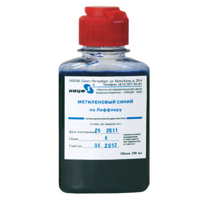 Раствор метиленового синего по Леффлеру (Метиленовый синий 0,3% раствор в 30% спирте этиловом 96_ с 0,1% гидроксидом калия), 100 мл – 1 фл.