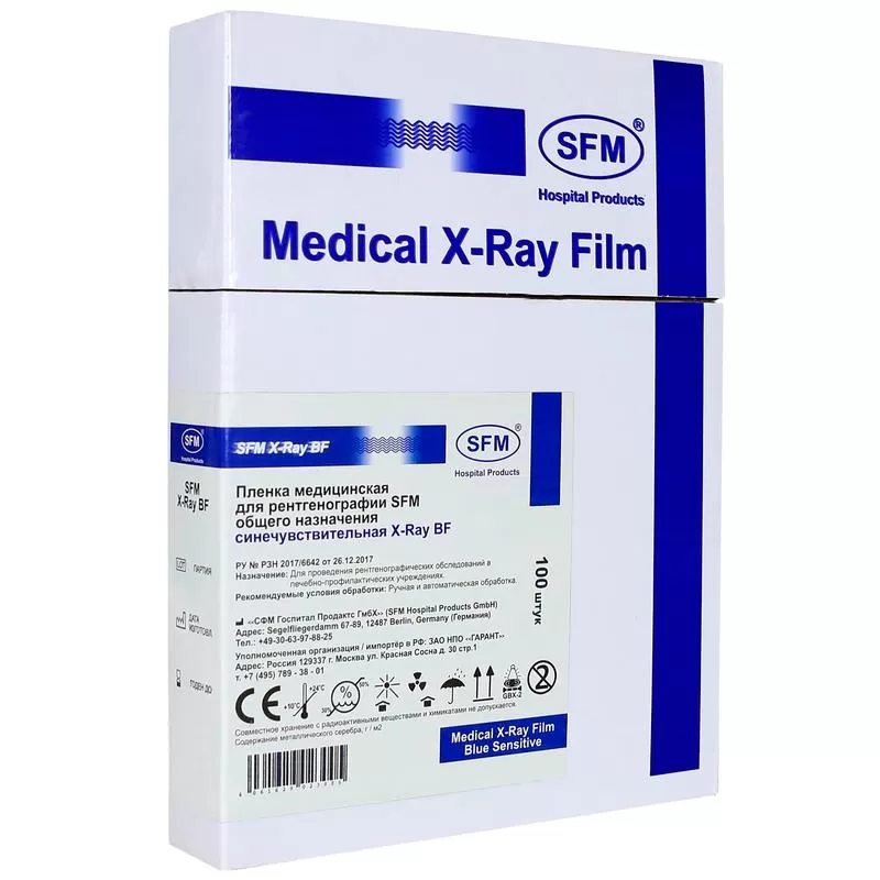 - Синечувствительная медицинская ретгенографическая пленка SFM X-ray BF предназначена для использования с недорогими экранами SFM класса 200 или аналогичными.