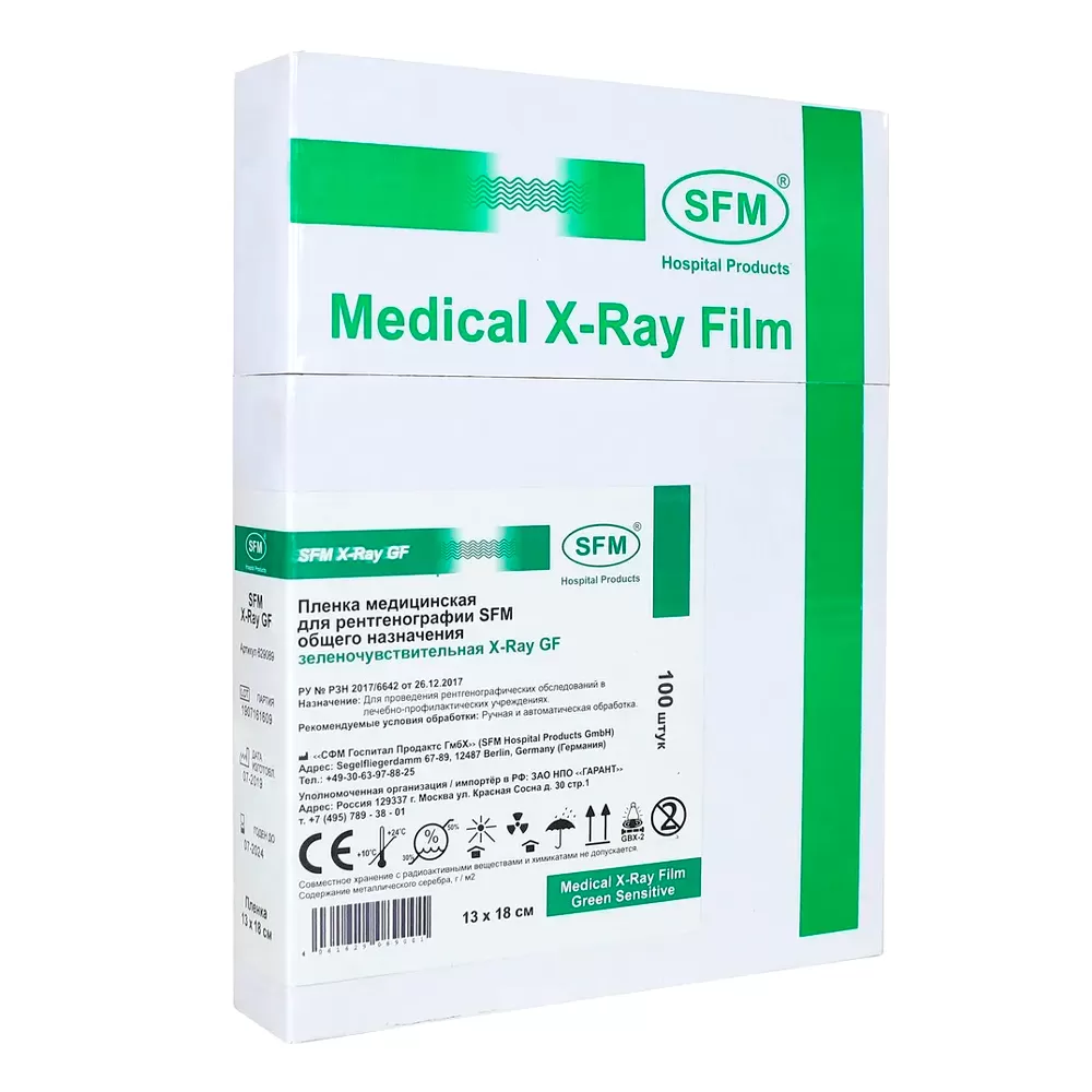 - Зелёночувствительная медицинская ретгенографическая плёнка SFM X-RAY GF прездназначена для использования с недорогими экранами SFM класса 200 или 400.