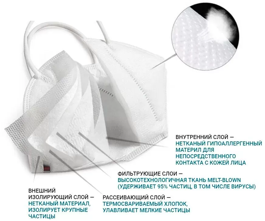 - Класс защиты респиратора - FFP2/KN95 (минимальная эффективность фильтрации _94%).