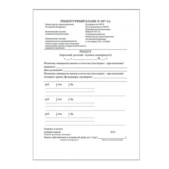 - Форма рецептурного бланка № 107-1/у соответствует Приложению №2 к Приказу Минздрава России от 24.11.2021 N 1094н "Об утверждении Порядка назначения лекарственных препаратов, форм рецептурных бланков на лекарственные препараты, Порядка оформления указанных бланков, их учета и хранения, форм бланков рецептов, содержащих назначение наркотических средств или психотропных веществ, Порядка их изготовления, распределения, регистрации, учета и хранения, а также Правил оформления бланков рецептов, в том числе в форме электронных документов"