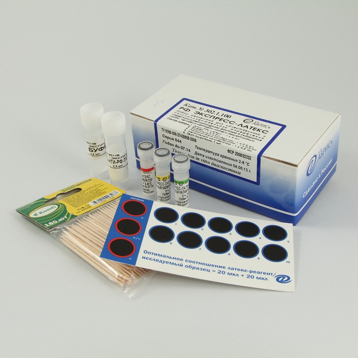 Набор реагентов для качественного и полуколичественного экспресс-определения содержания ревматоидного фактора в сыворотке крови методом латекс-агглютинации.