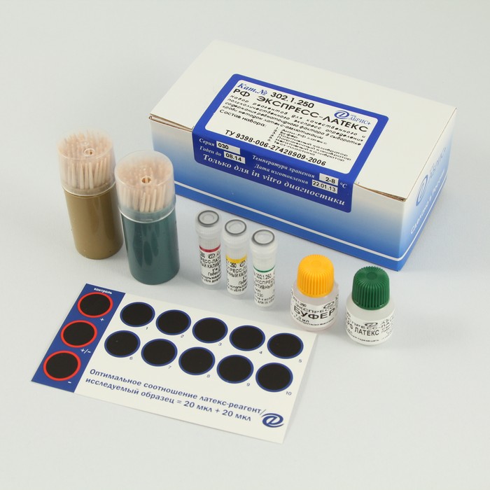 Набор реагентов для качественного и полуколичественного экспресс-определения содержания ревматоидного фактора в сыворотке крови методом латекс-агглютинации.