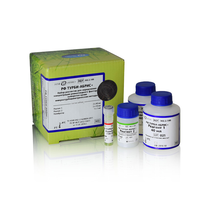 Набор реагентов для определения концентрации ревматоидного фактора в сыворотке крови иммунотурбидиметрическим методом.