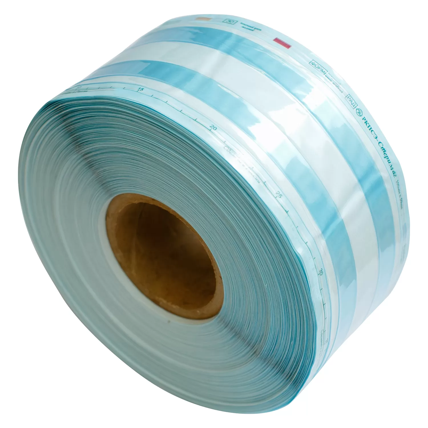 - Рулоны комбинированные представляют собой объемные рукава из различных сортов специальных бумаг (непрозрачная сторона) и прозрачной полимерной пленки (прозрачная сторона со складками (объемный рулон)), соединенные между собой термическим швом. На бумажной стороне рукава нанесена соответствующая маркировка с химическими индикаторами 1 класса по ГОСТ ISO 11140-2011.