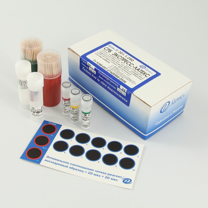 Набор реагентов для качественного и полуколичественного экспресс-определения содержания С-реактивного белка в сыворотке крови методом латекс-агглютинации.