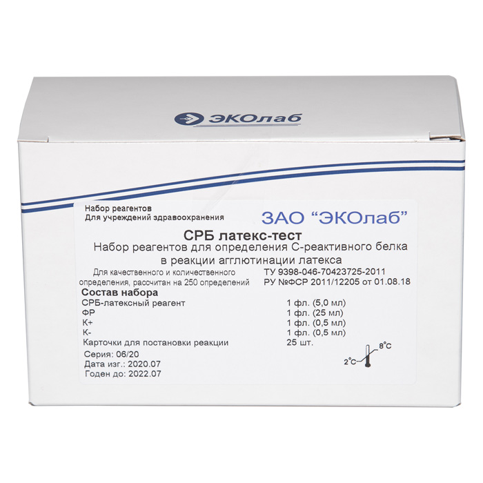 Набор реагентов для определения С-реактивного белка в реакции агглютинации латекса предназначен для выявления и определения содержания СРБ в сыворотке крови человека методом реакции агглютинации латекса (РАЛ). СРБ является белком острой фазы, концентрация которого возрастает при воспалительных процессах, повреждениях тканей, бактериемии и вирусных инфекциях.