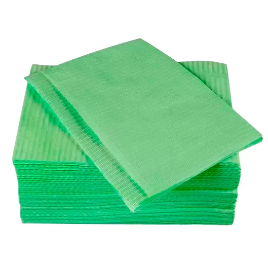 - Салфетки нагрудные или салфетки процедурные сделаны из одного слоя сверхабсорбирующей 100% целлюлозной бумаги-основы с плотностью 18 г/м. кв. и одного слоя тонкой, прочной полиэтиленовой пленки.