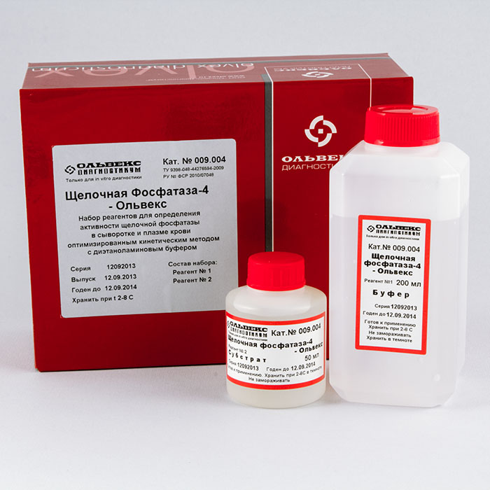 Набор реагентов «ЩЕЛОЧНАЯ ФОСФАТАЗА-4-ОЛЬВЕКС» предназначен для количественного определения активности щелочной фосфатазы в сыворотке и плазме крови оптимизированным кинетическим энзиматическим методом.