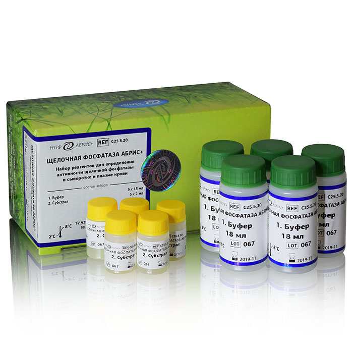 Набор реагентов для определения активности щелочной фосфатазы в сыворотке и плазме крови кинетическим методом с ДЭА буфером.