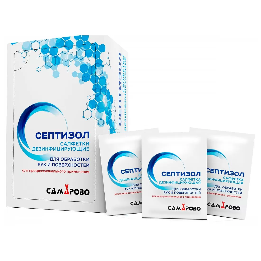 - салфетка из нетканого материала от белого до желтоватого цвета, пропитанная прозрачным бесцветным раствором кожного антисептика “ИзАсептик” в количестве 4,3г на салфетку.