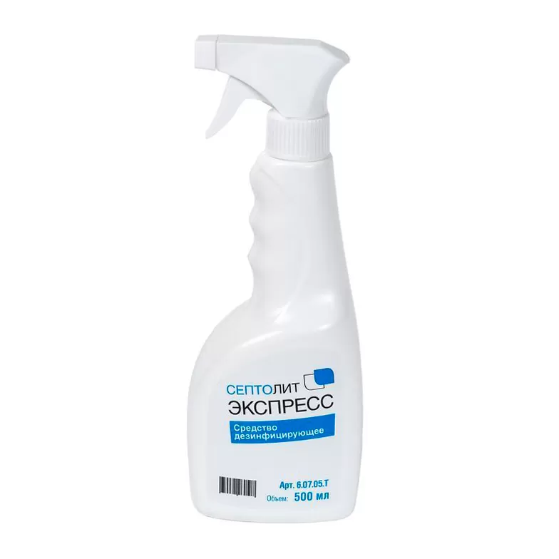 Дезинфицирующее средство Септолит-Экспресс предназначено для дезинфекции небольших по площади или труднодоступных поверхностей в помещениях, поверхностей медицинских приборов и оборудования, оптических приборов, оборудования, датчиков диагностического оборудования, обеззараживания надетых на руки персонала перчаток из неопрена, нитрила и других материалов, устойчивых к воздействию спиртов, перед их утилизацией, дезинфекции поверхностей столов, гинекологических и стоматологических кресел, кроватей, реанимационных матрацев и др. жесткой мебели, предметов ухода за больными, игрушек из гладких материалов; компьютерной и другой офисной техники, оборудования и поверхностей машин скорой медицинской помощи и санитарного транспорта, резиновых и полипропиленовых ковриков, обуви для профилактики грибковых заболеваний и других объектов, требующих быстрого обеззараживания и высыхания; применения населением в быту.