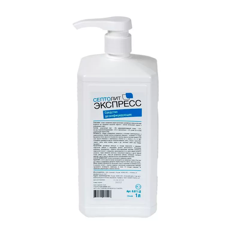 Дезинфицирующее средство Септолит-Экспресс предназначено для дезинфекции небольших по площади или труднодоступных поверхностей в помещениях, поверхностей медицинских приборов и оборудования, оптических приборов, оборудования, датчиков диагностического оборудования, обеззараживания надетых на руки персонала перчаток из неопрена, нитрила и других материалов, устойчивых к воздействию спиртов, перед их утилизацией, дезинфекции поверхностей столов, гинекологических и стоматологических кресел, кроватей, реанимационных матрацев и др. жесткой мебели, предметов ухода за больными, игрушек из гладких материалов; компьютерной и другой офисной техники, оборудования и поверхностей машин скорой медицинской помощи и санитарного транспорта, резиновых и полипропиленовых ковриков, обуви для профилактики грибковых заболеваний и других объектов, требующих быстрого обеззараживания и высыхания; применения населением в быту.