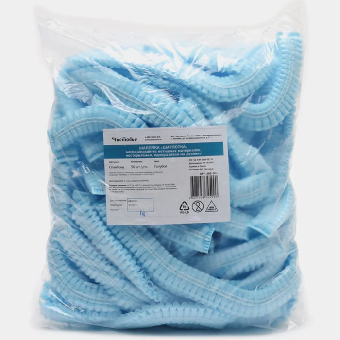 Шапочка одноразовая Шарлотта медицинская, нестерильная - предназначена для одноразового применения. Медицинская шапочка (берет) используется в медицинских учреждениях, салонах красоты, на объектах пищевой и электронной промышленности, в быту. Защитные шапочки нетоксичны, гипоаллергенны и воздухопроницаемы, практически невесомы, поэтому не создают ощущение головного убора. Оснащены мягкой полимерной резинкой, которая обеспечивает надежную фиксацию, при этом не сильно давят на лоб, что способствует комфортной работе сотрудников. Медицинский берет предназначен для защиты прически от вредных факторов окружающей среды и одновременно обеспечивает гигиену и чистоту в помещении.