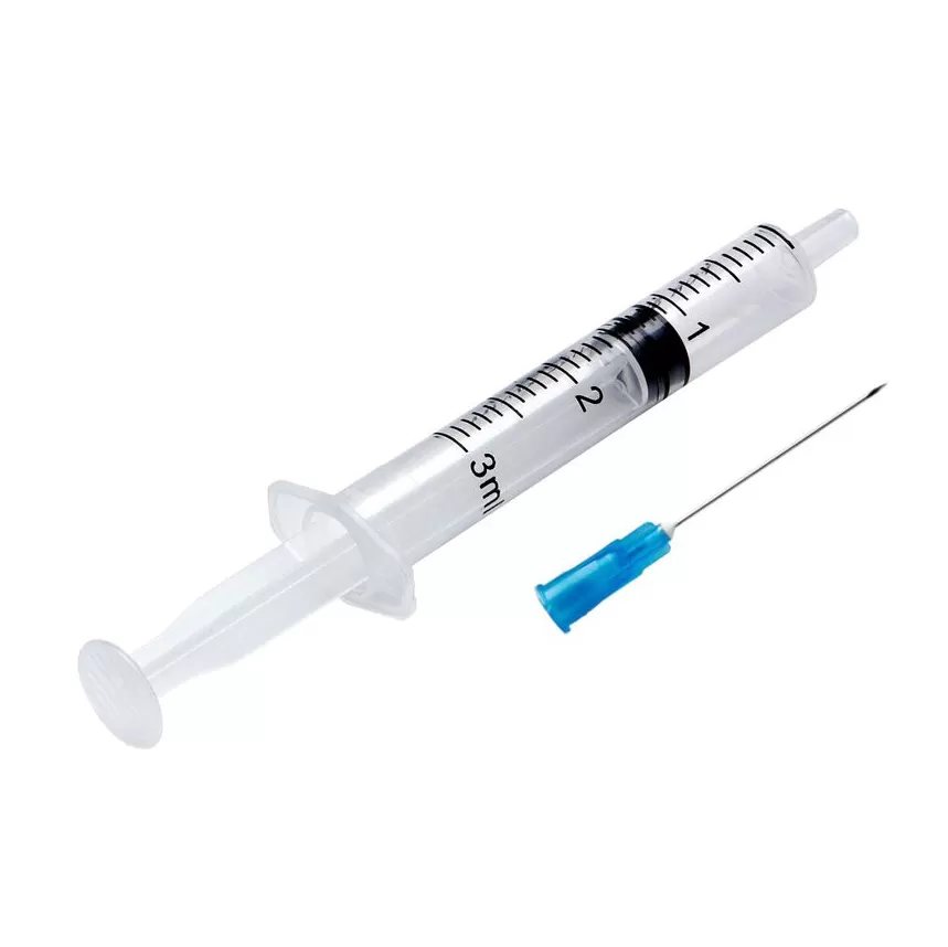 Шприц медицинский одноразовый 3 мл, трехкомпонентный инъекционный однократного применения с приложенной иглой.