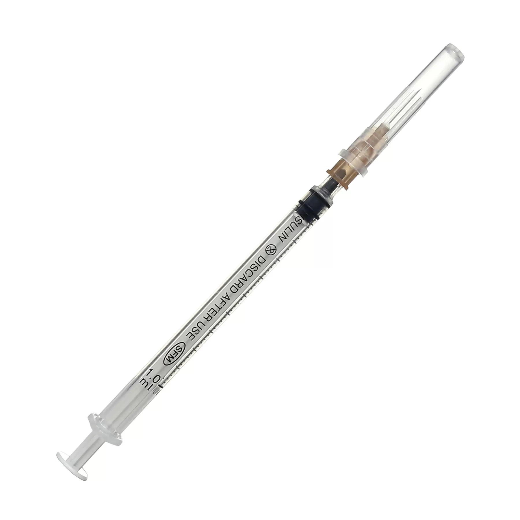 Шприц инсулиновый со шкалой U-100 с надетой иглой.