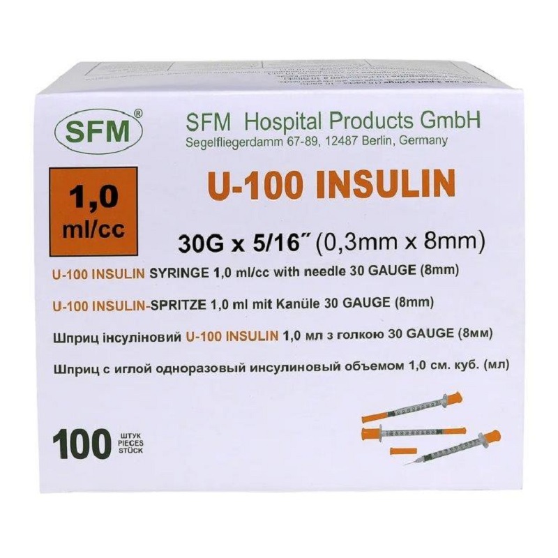Шприц инсулиновый 1,0 мл со шкалой U-100 с интегрированной иглой 0,30 ⨯ 8 (30 G).