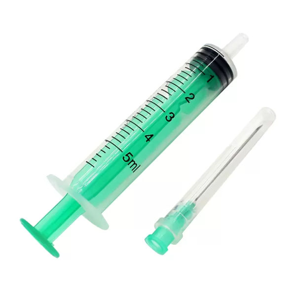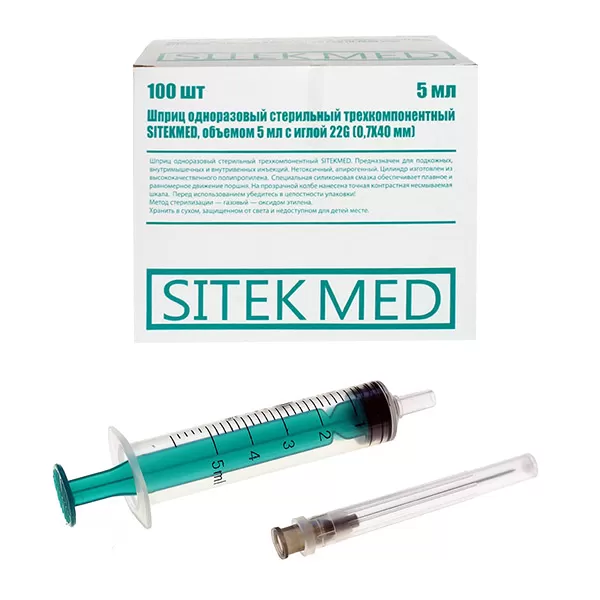 Трехкомпонентный шприц объемом 5 мл, индивидуально упакован в блистер, игла лежит рядом.