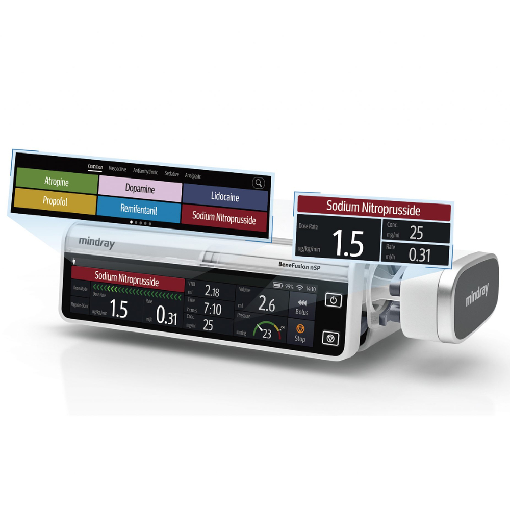 Mindray BeneFusion nSP оснащен цветным сенсорным экраном 7 дюймов с широким углом обзора. Есть инфузионная станция, варианты заданной скорости инфузии.