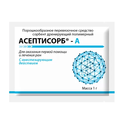- порошкообразное перевязочное средство, которое необратимо сорбирует из раны до 17 г/г раневого отделяемого. Осмотическая активность Асептисорб-А сопоставима с аналогичным параметром для белков, в связи с этим, при наличии выраженного противоотечного действия, он не оказывает патологического воздействия на клетки.