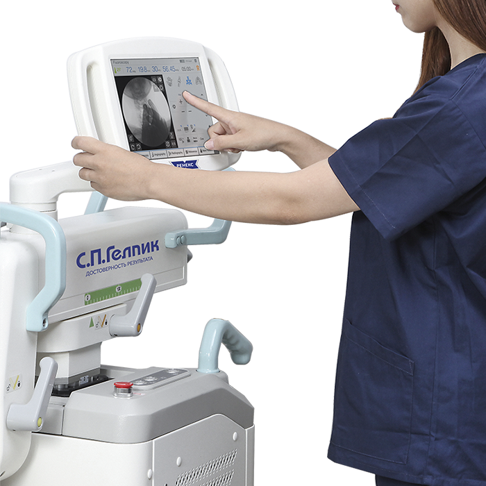 - Сенсорный интерактивный пульт управления. Конструкция пульта с использованием современной технологии Touch screen позволяет управлять работой аппарата и производить исследования путем нескольких прикосновений к сенсорной поверхности экрана, что значительно упрощает работу рентгенолаборанта.