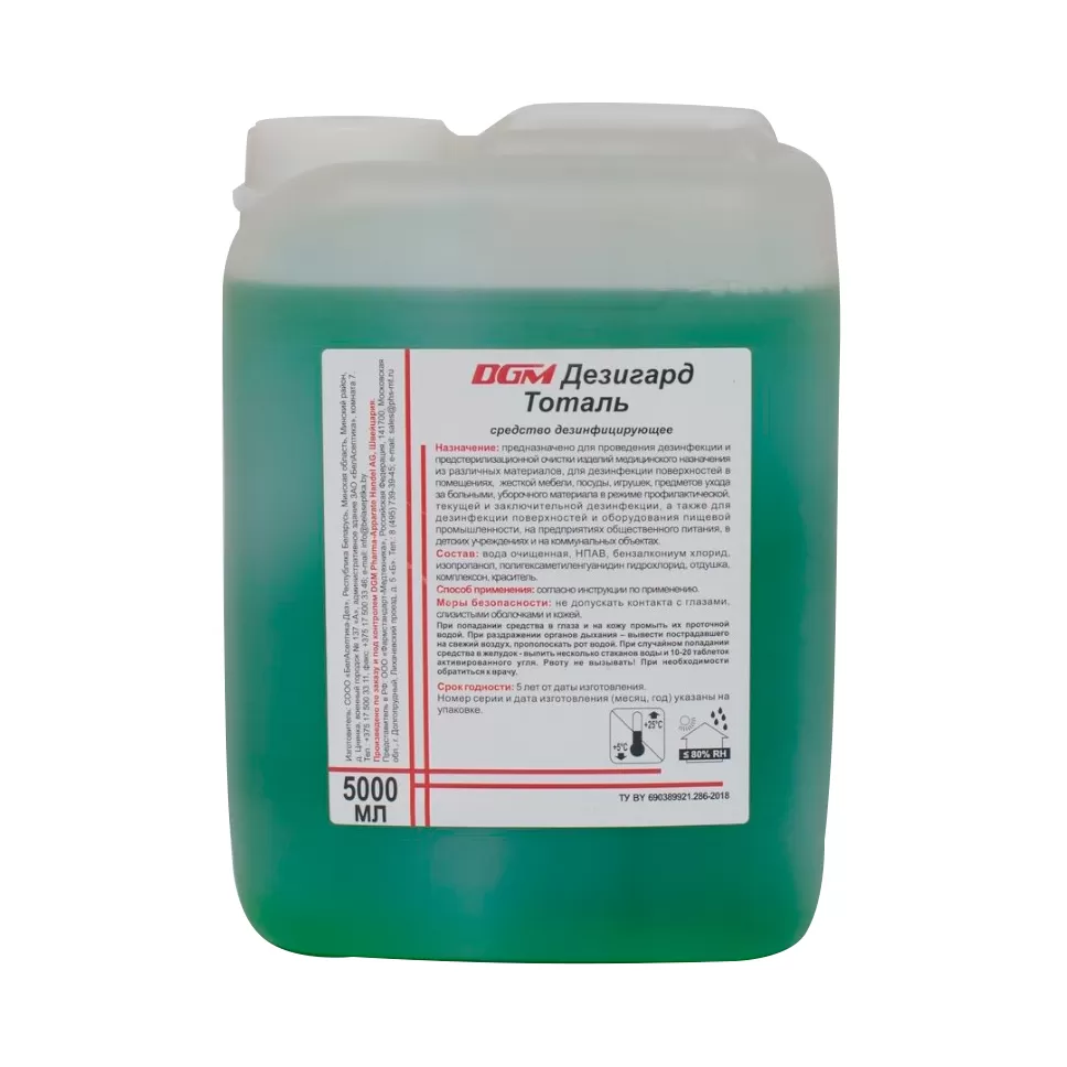 Средство «DGM Дезигард Тоталь» представляет собой прозрачную жидкость от светло-зелёного до зелёного цвета с цитрусовым запахом (допускается присутствие запаха изопропанола и сырьевых компонентов). Допускается изменение цвета в процессе хранения до зеленовато-желтого.