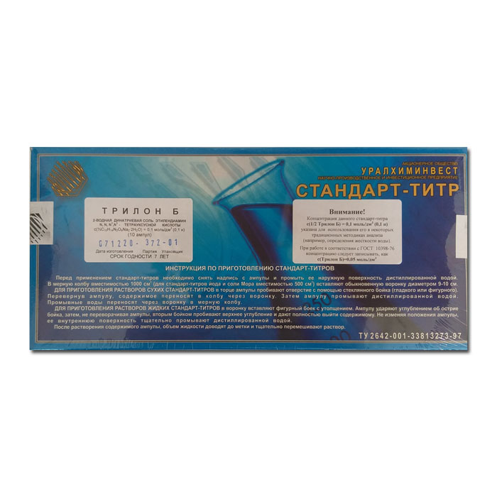 Стандарт-титр Трилон Б 0,1 Н используется для приготовления титрованных (стандартных) растворов с заданным объёмом и точной концентрацией.
