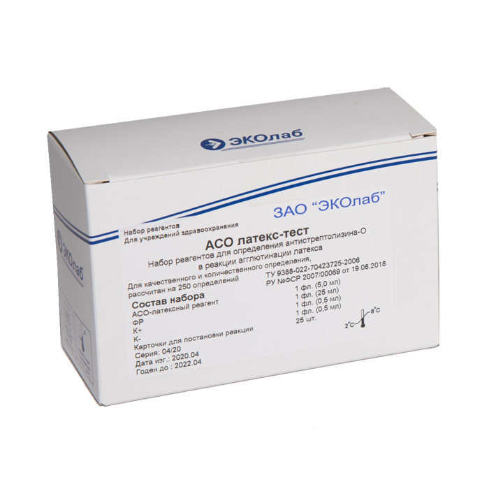 Набор реагентов для определения антистрептолизина-О в реакции агглютинации латекса предназначен для качественного и количественного определения антистрептолизина-О (АСО) в сыворотке крови человека. Может применяться при диагностике и контроле терапии ревматической лихорадки, острого ревматоидного артрита, гломерулонефрита и других заболеваний, вызванных _-гемолитическими стрептококками группы А, С и G.