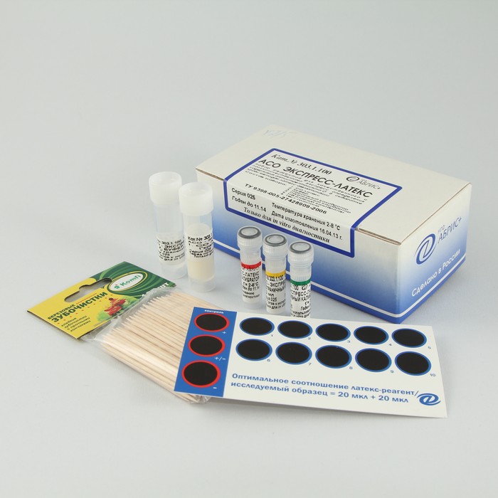 Набор реагентов для качественного и полуколичественного экспресс определения содержания антистрептолизина-О в сыворотке крови методом латекс-агглютинации.