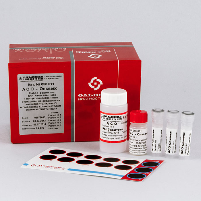 Набор реагентов «Антистрептолизин Ольвекс» предназначен для качественного и полуколичественного определения содержания антител к стрептолизину О (антистрептолизин О, АСО) в сыворотке крови человека методом латекс-агглютинации. Количество определений – 100, при объеме рабочего реагента – 20 мкл. Количество исследований определяется расходом Реагента 1 (АСО-латекс суспензия) на постановку одного теста или 100 определений при расходе 20 мкл Реагента 1.