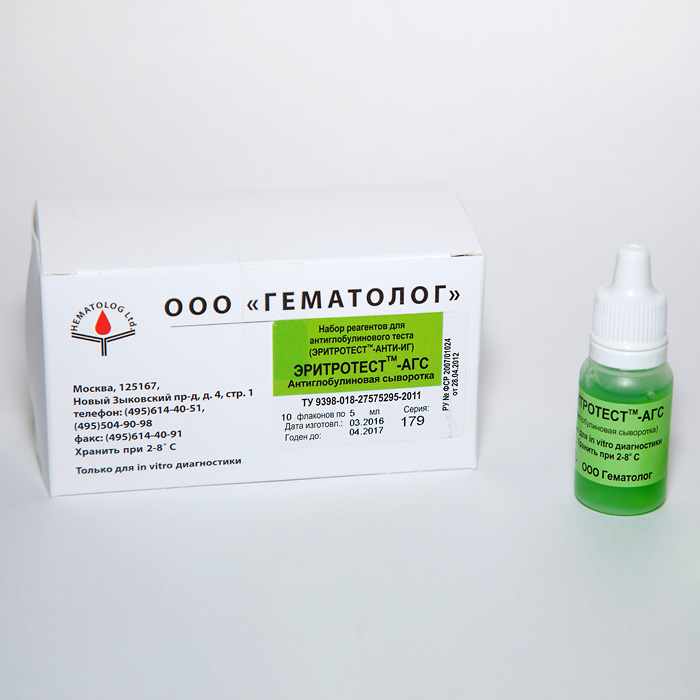 Антиглобулиновая сыворотка ЭРИТРОТЕСТ-АГС - реагент, представляющий собой смесь антисыворотки к глобулинам человека и моноклональных анти-C3d антител. Предназначена для проведения пробы на индивидуальную совместимость донора и реципиента, для тестирования сыворотки больного на наличие иммунных антител, для типирования крови с помощью реагентов, содержащих неполные антитела, для проведения прямой пробы Кумбса с целью обнаружения аутосенсибилизации эритроцитов.