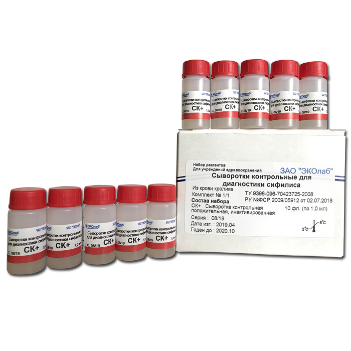 СК+ – сыворотка контрольная положительная – сыворотка крови кролика, содержащая антитела к Treponema pallidum при определении в «Сифилис РПГА–тест» «ЗАО ЭКОлаб» в титре 1:2560, обеспечивающая в РПМ и RPR реакцию не ниже положительной (от 3+ до 4+); прозрачная, от светло–жёлтого до буроватого цвета жидкость.