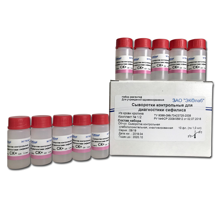 СК+сл – сыворотка контрольная слабоположительная – сыворотка крови кролика, содержащая антитела к Treponema pallidum при определении в «Сифилис РПГА–тест» в титре 1:640, обеспечивающая в РПМ и RPR слабоположительную реакцию (2+); прозрачная, от светло–жёлтого до буроватого цвета жидкость.